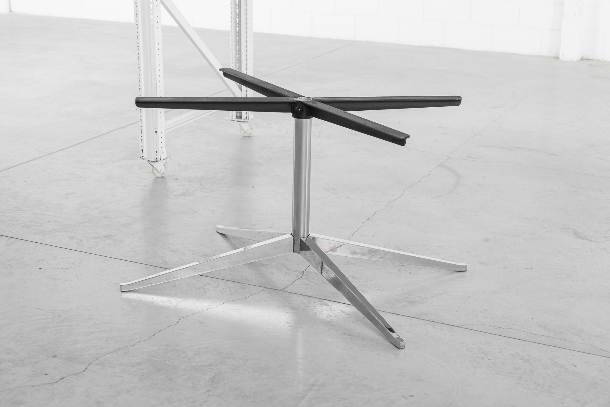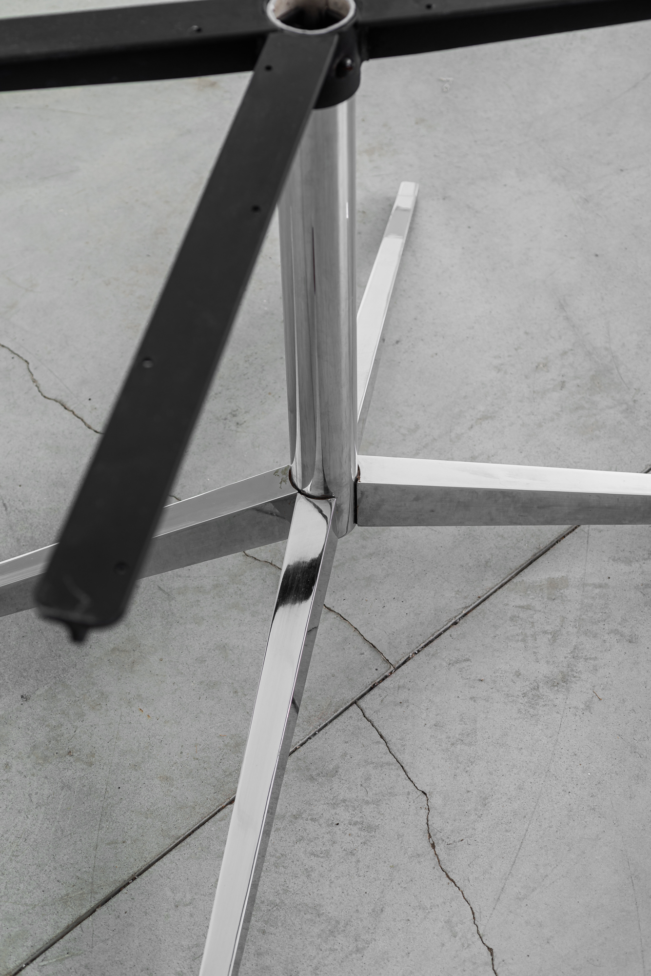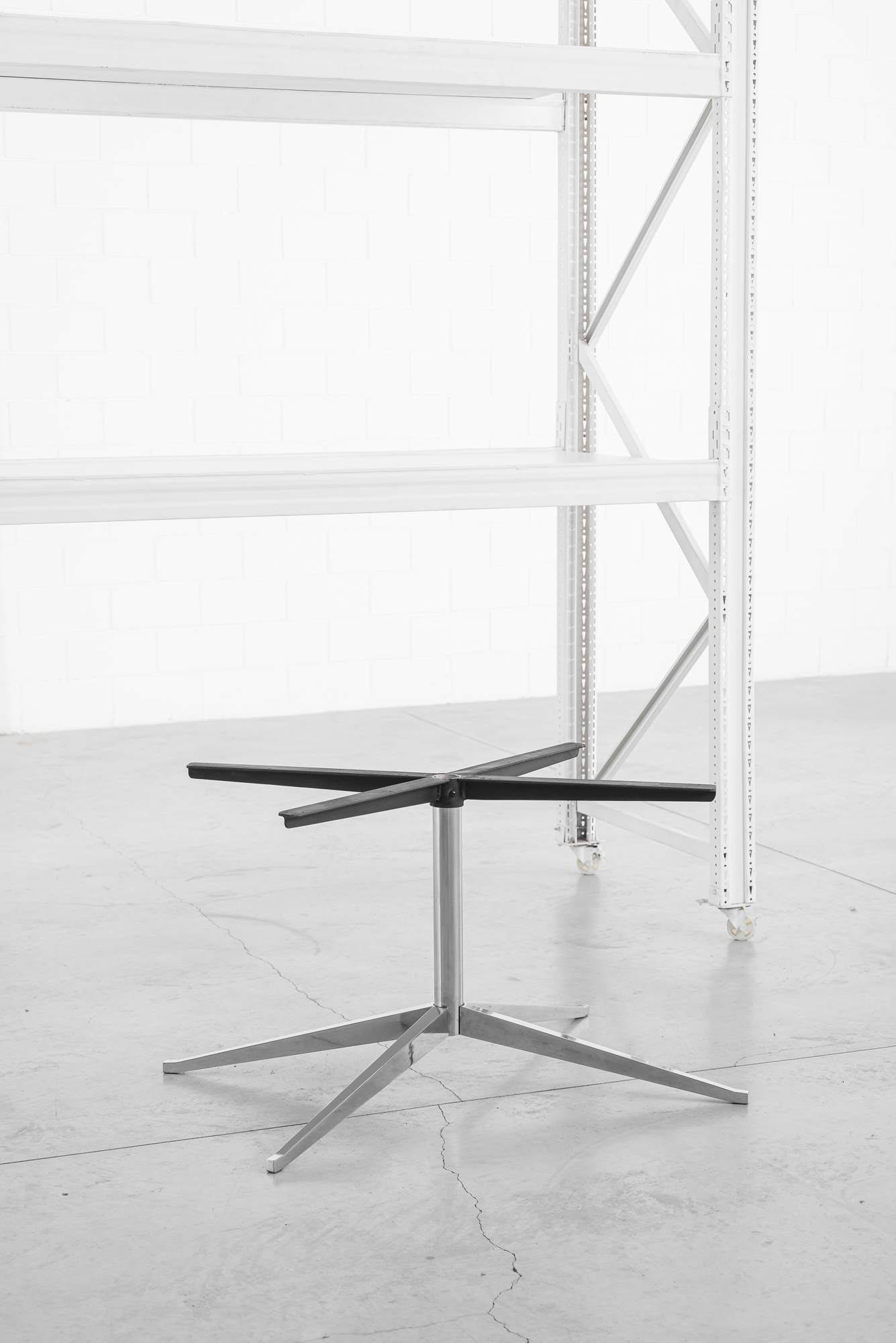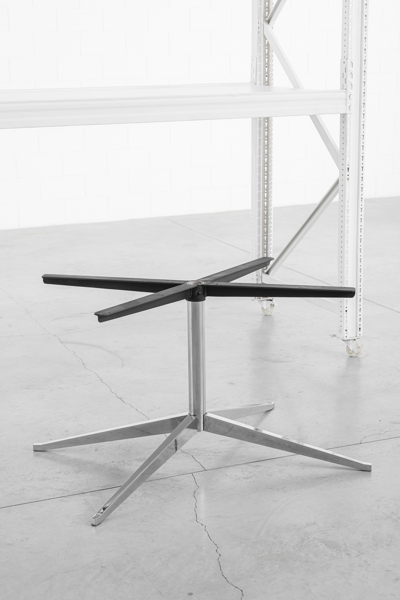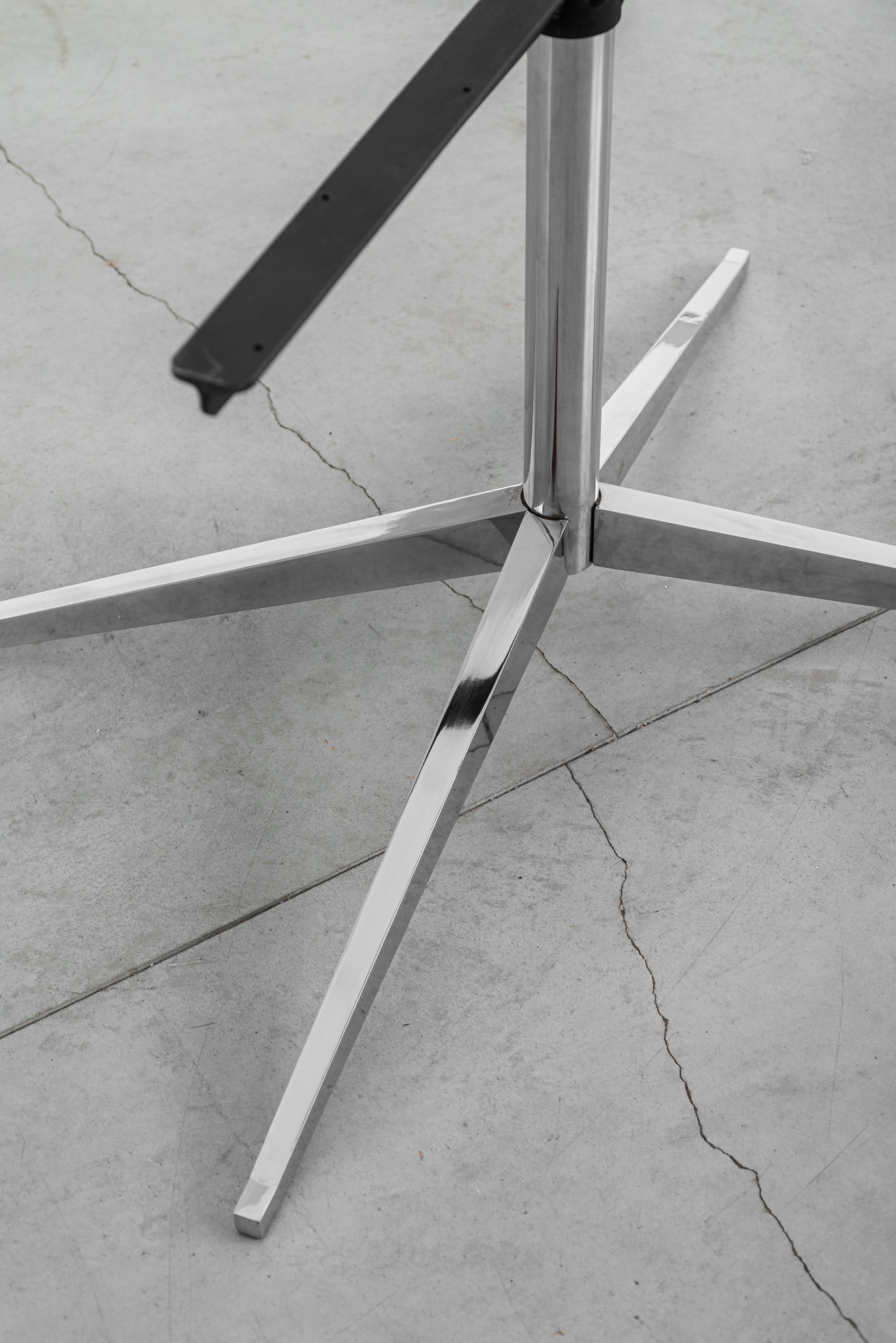 Base em metal cromado e tampo em madeira compensada com acabamento melamínico.