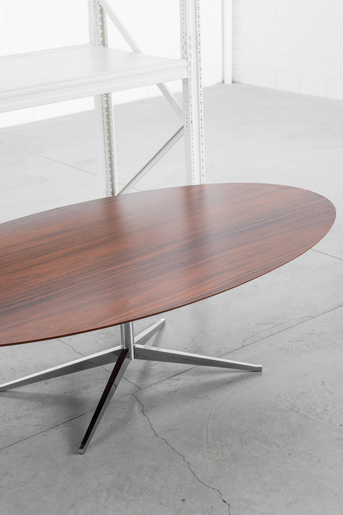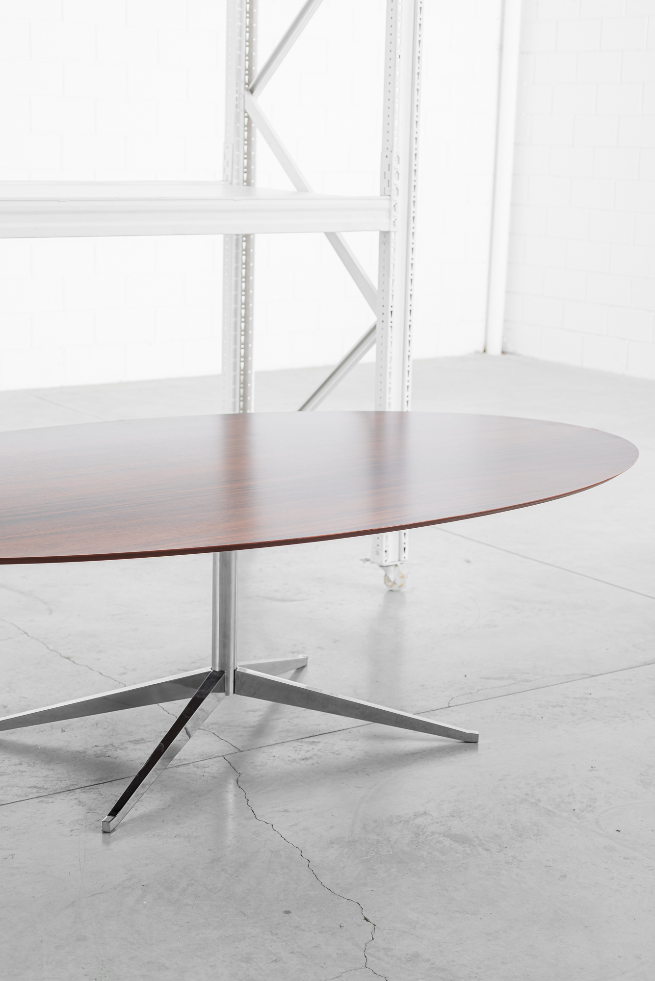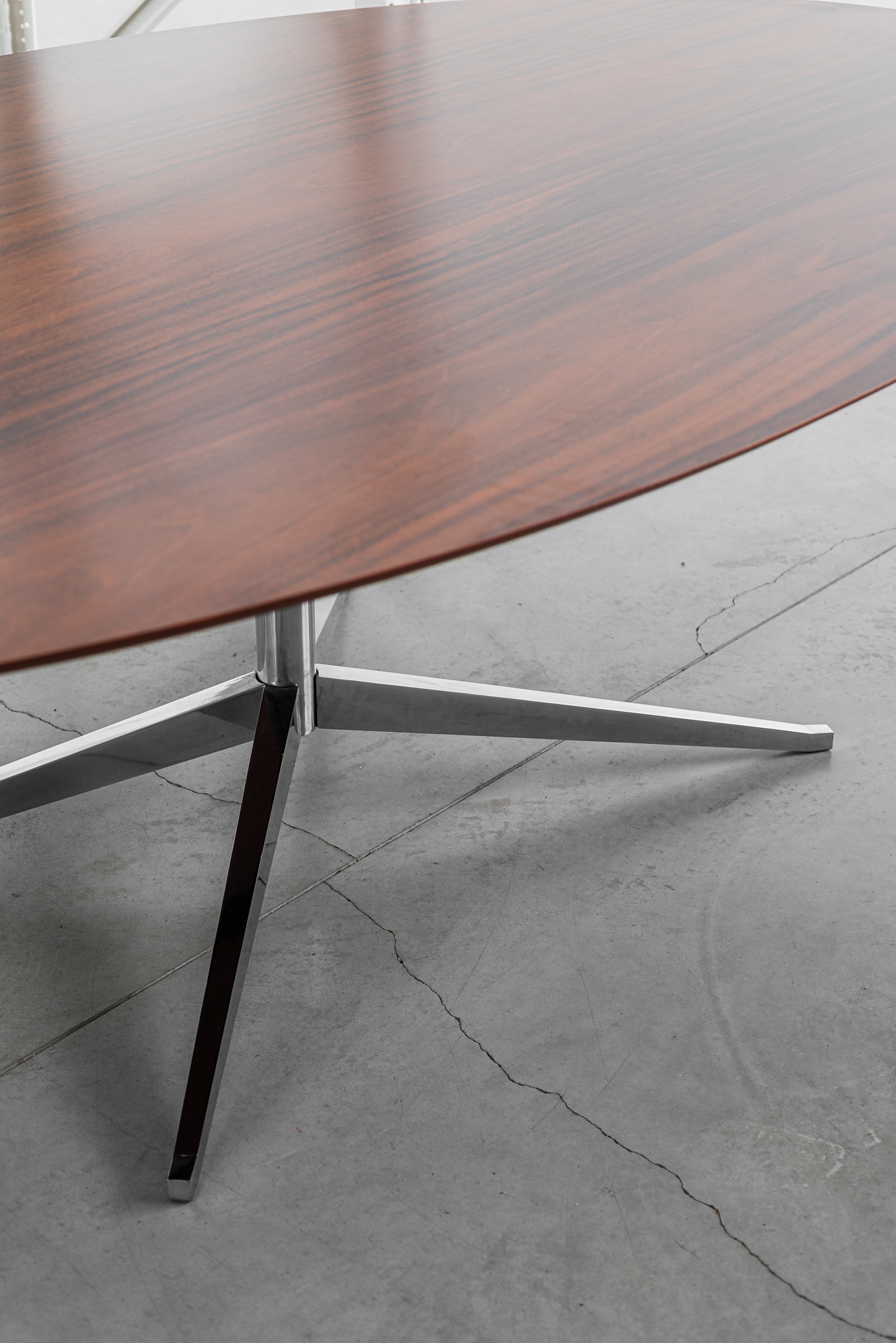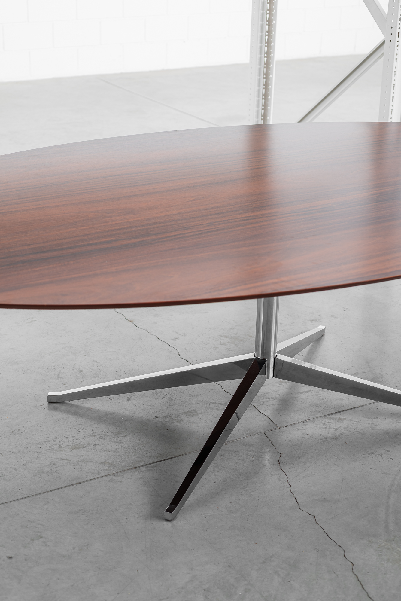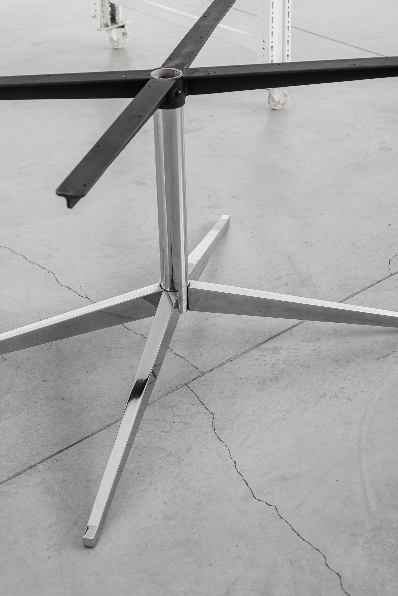 Base em metal cromado e tampo em madeira compensada com acabamento melamínico.