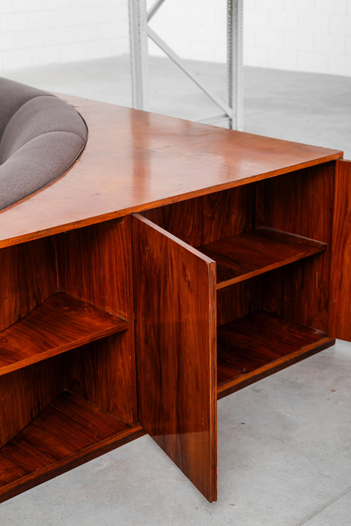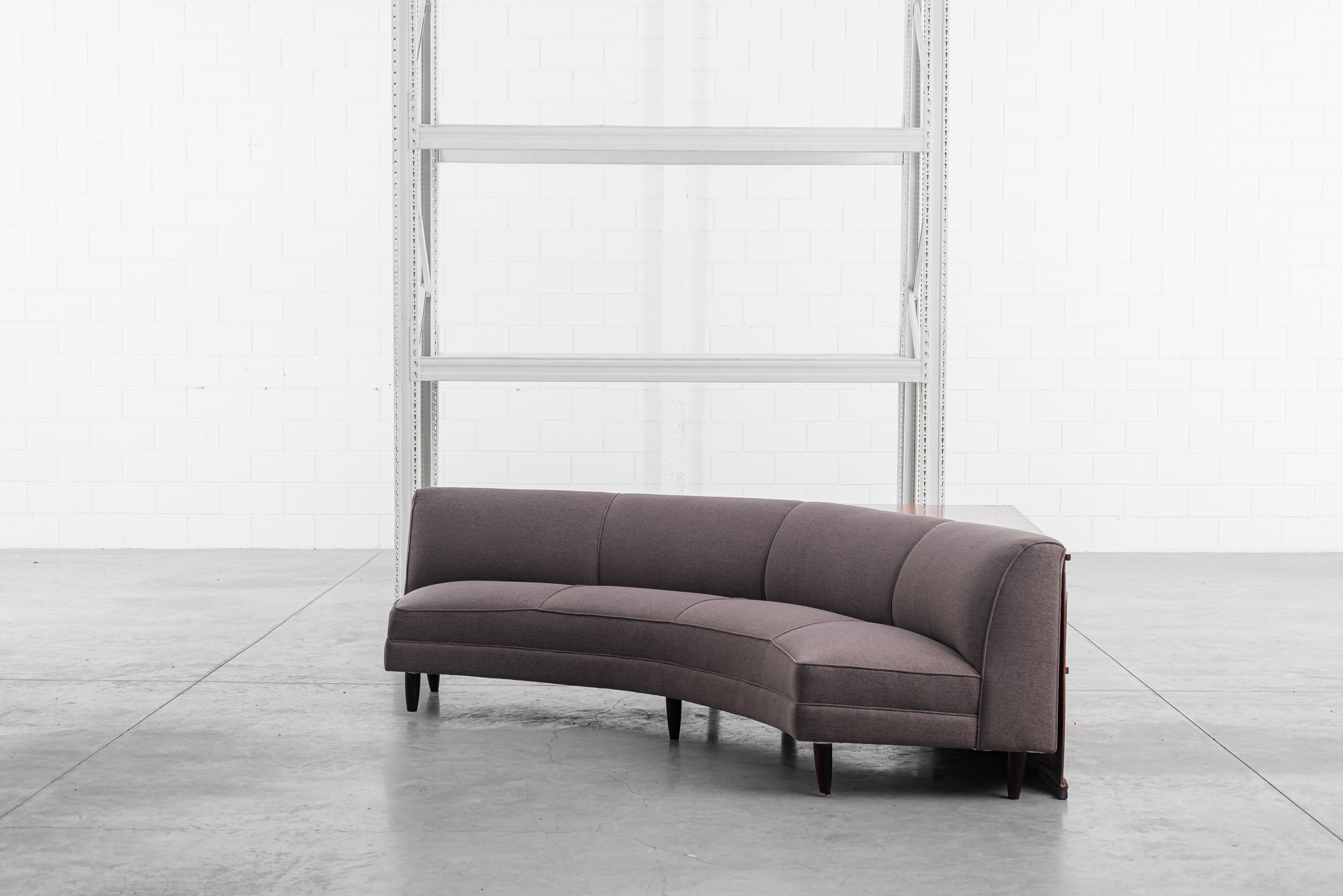 Sofá curvo em tecido com pés em madeira nobre maciça.