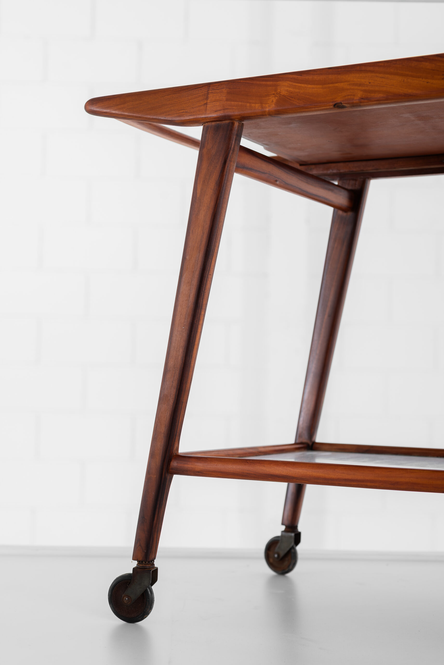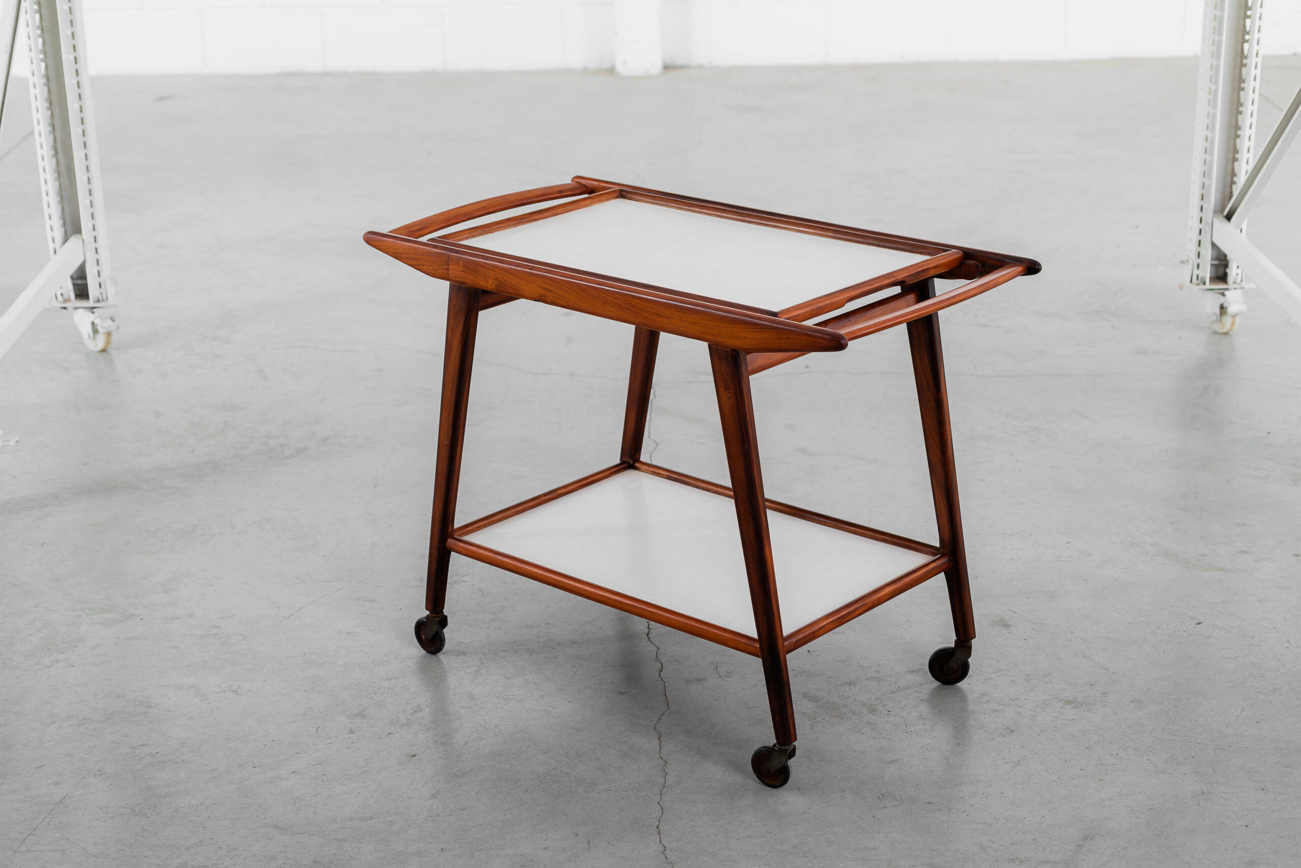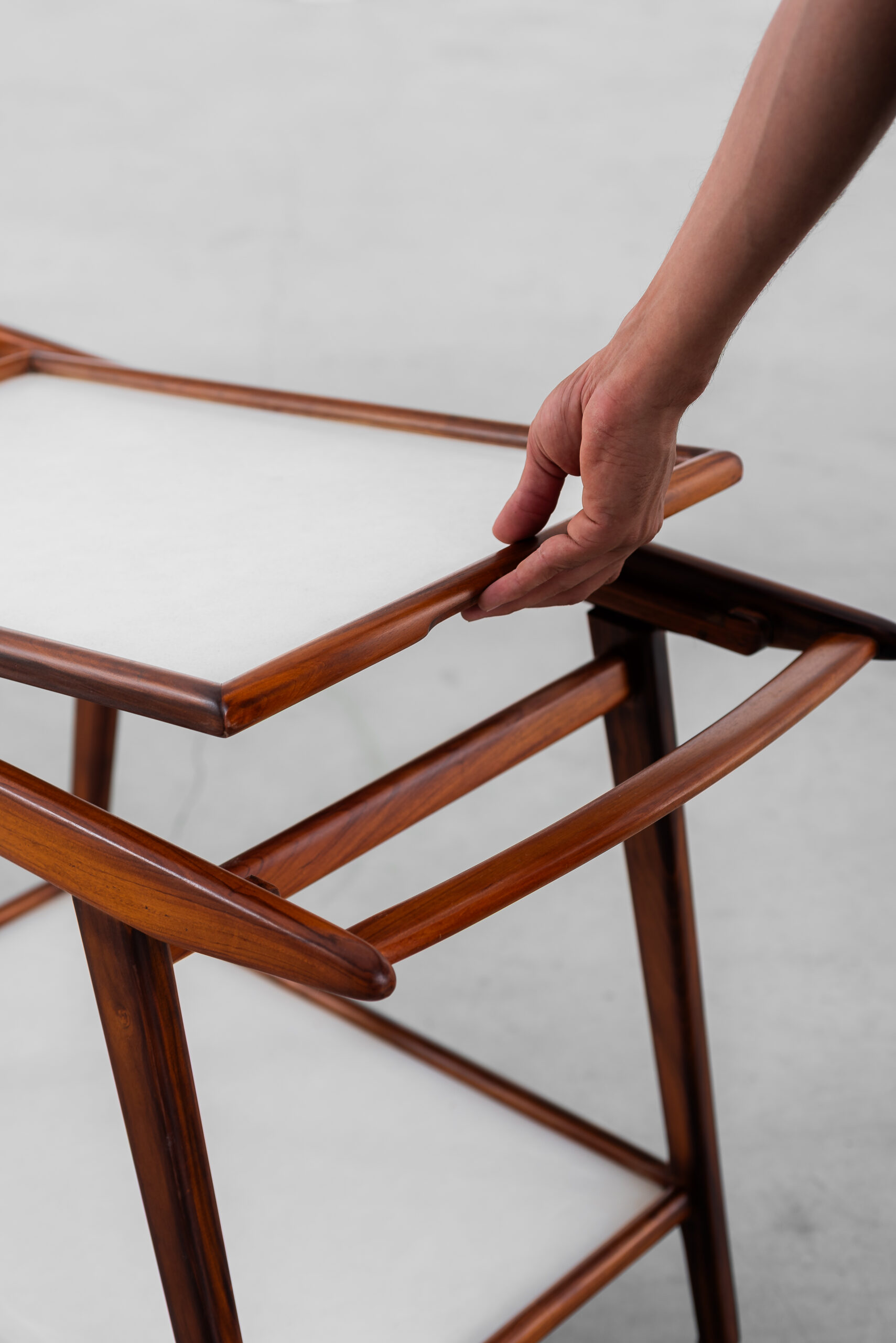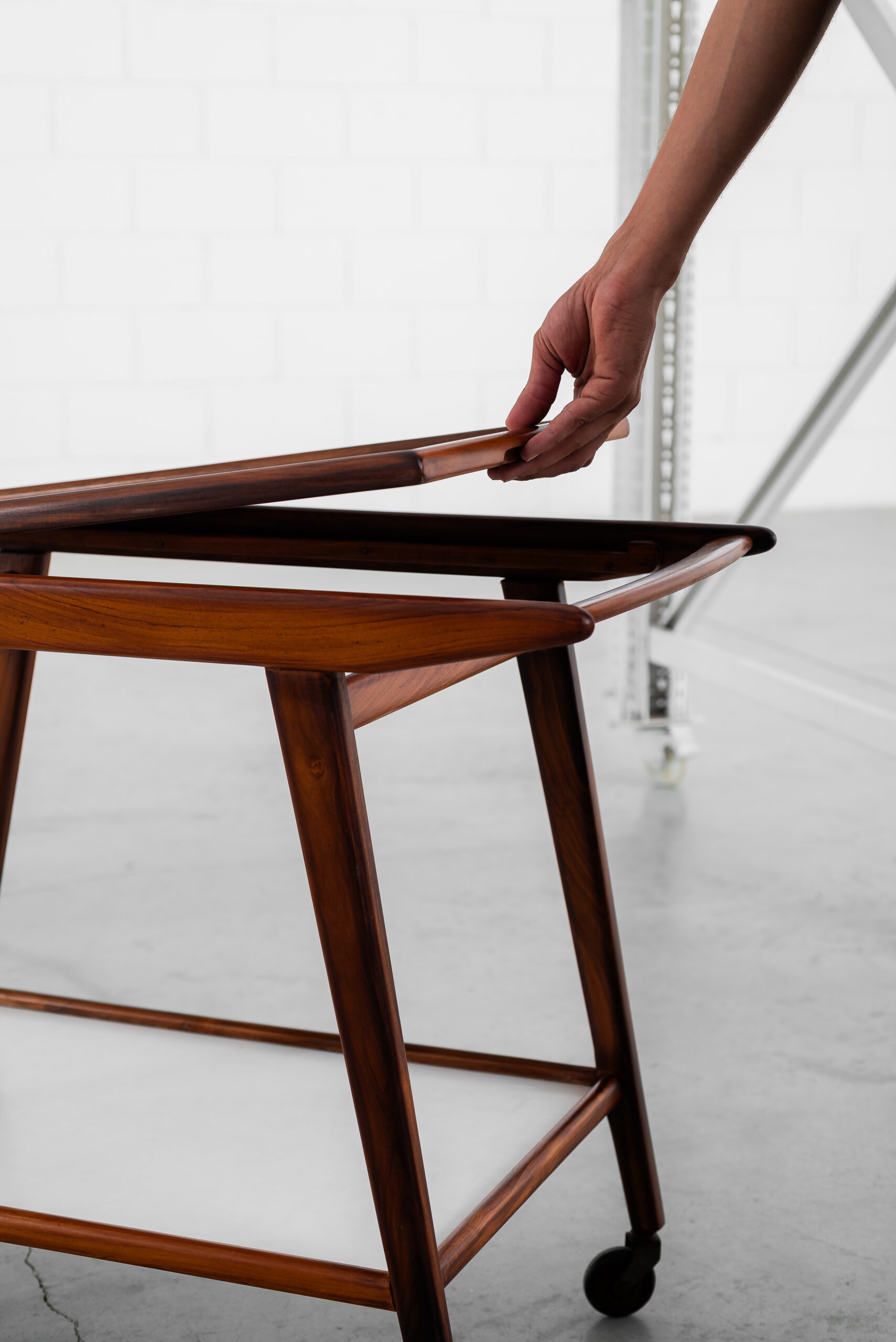 Carrinho de bebidas em madeira nobre e fórmica branca.