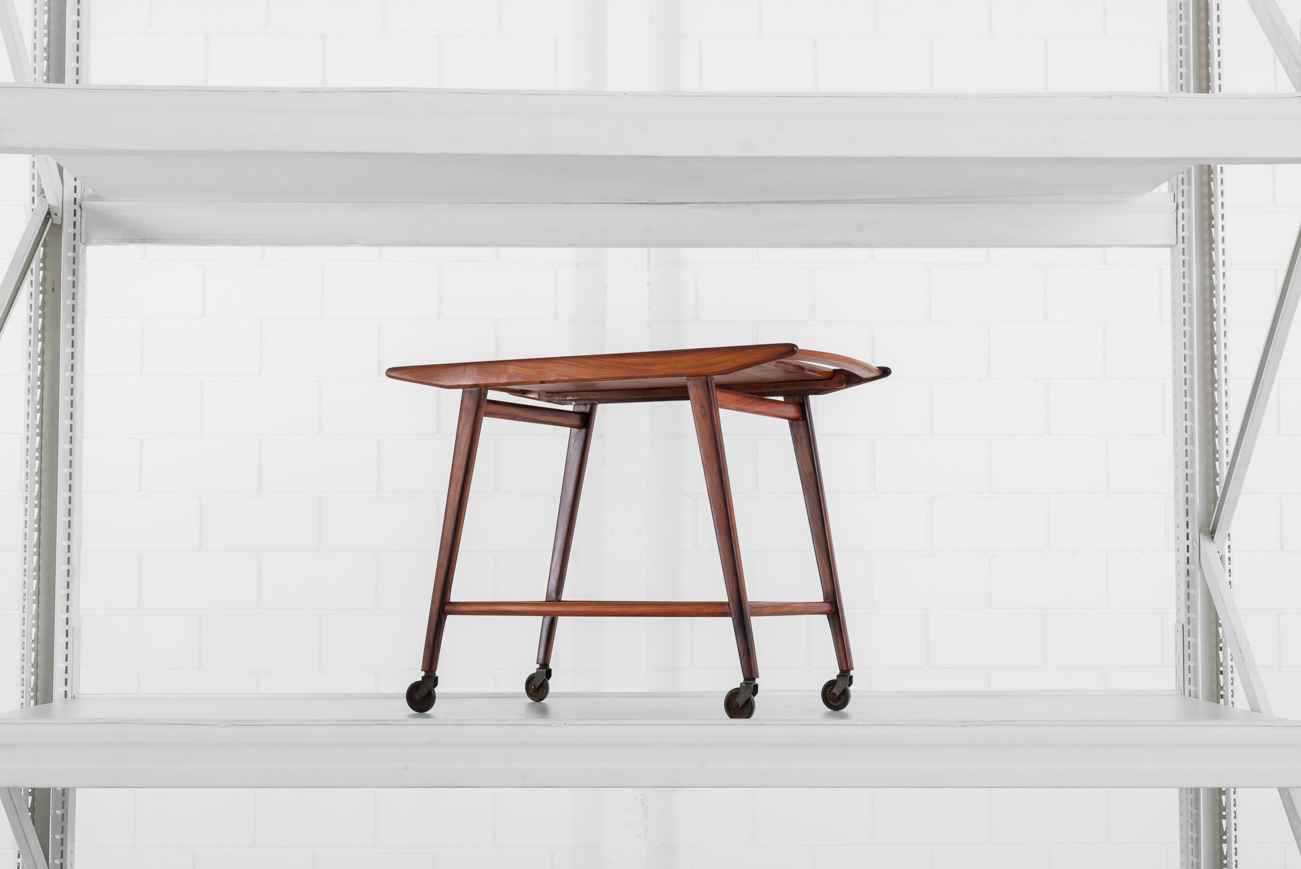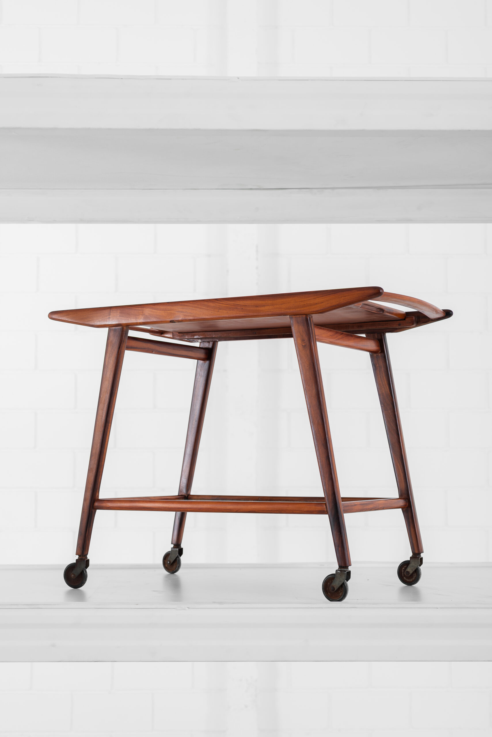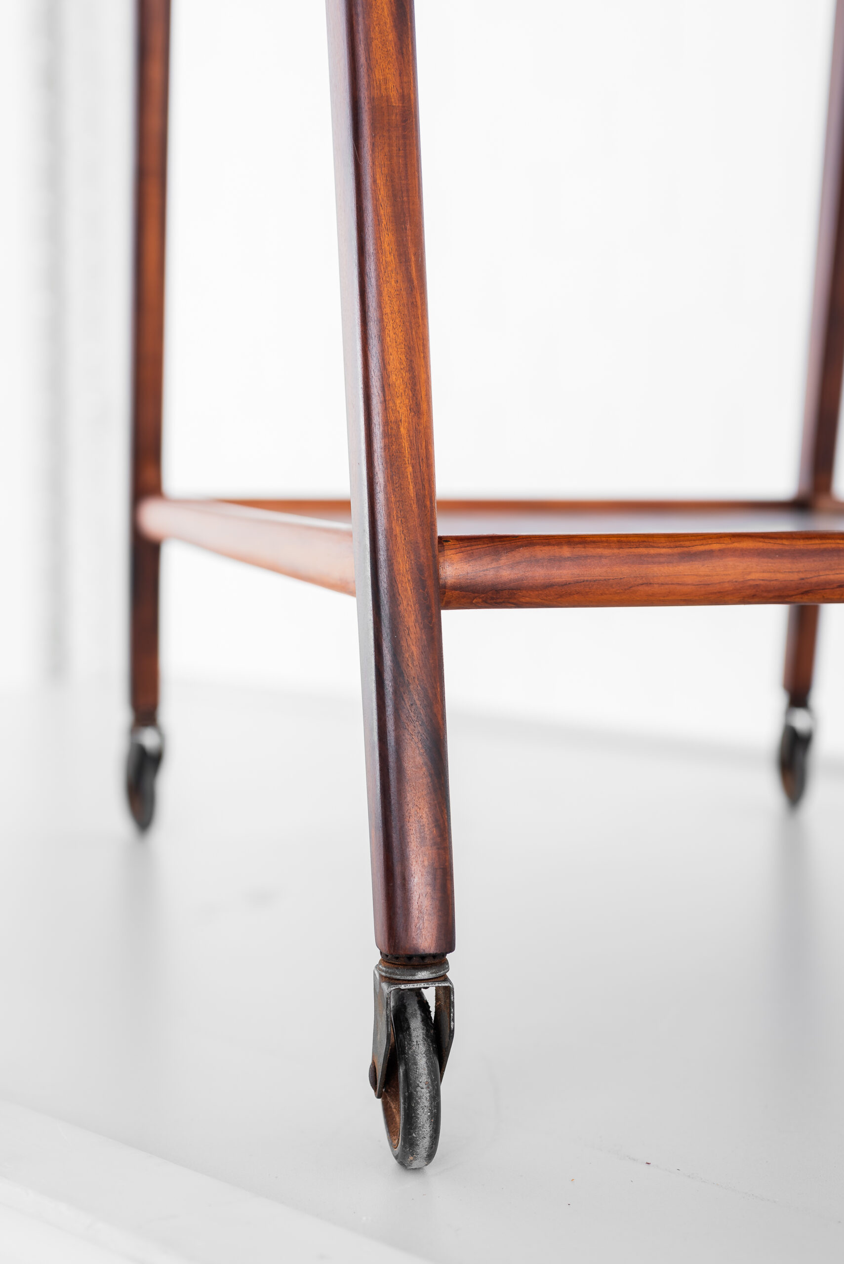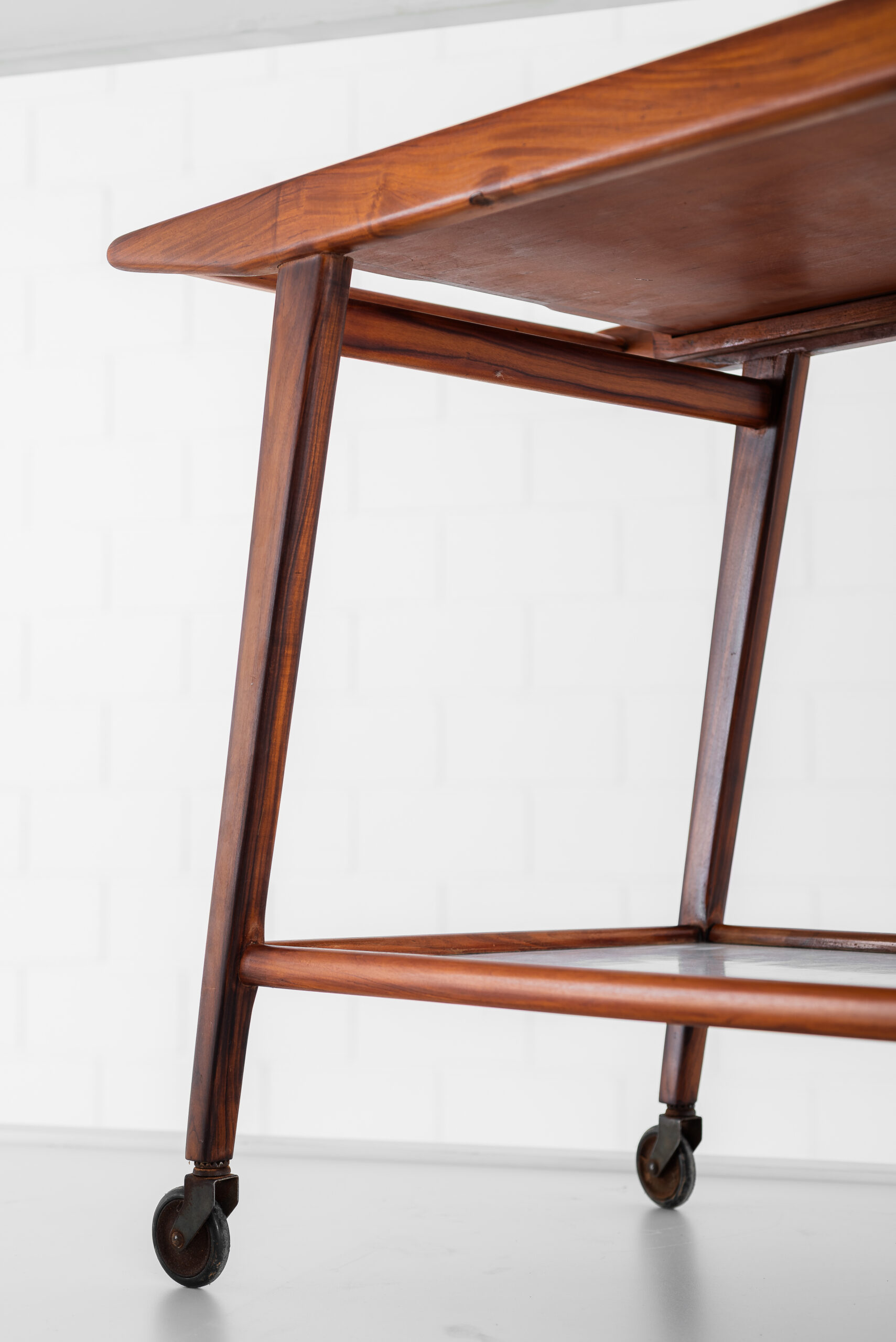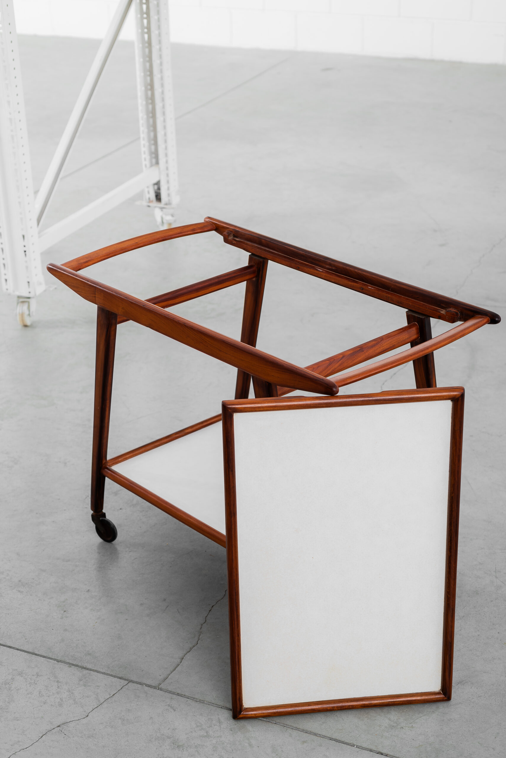 Carrinho de bebidas em madeira nobre e fórmica branca.