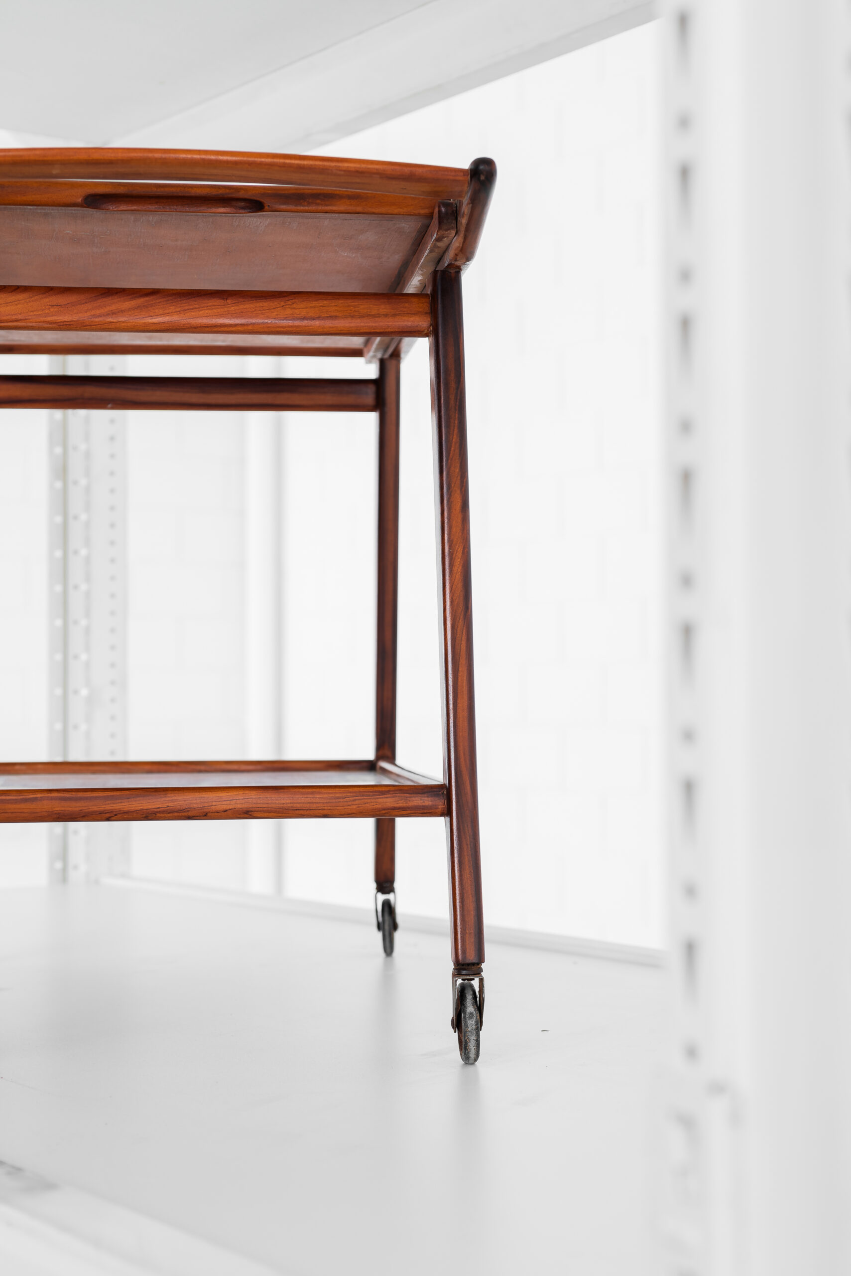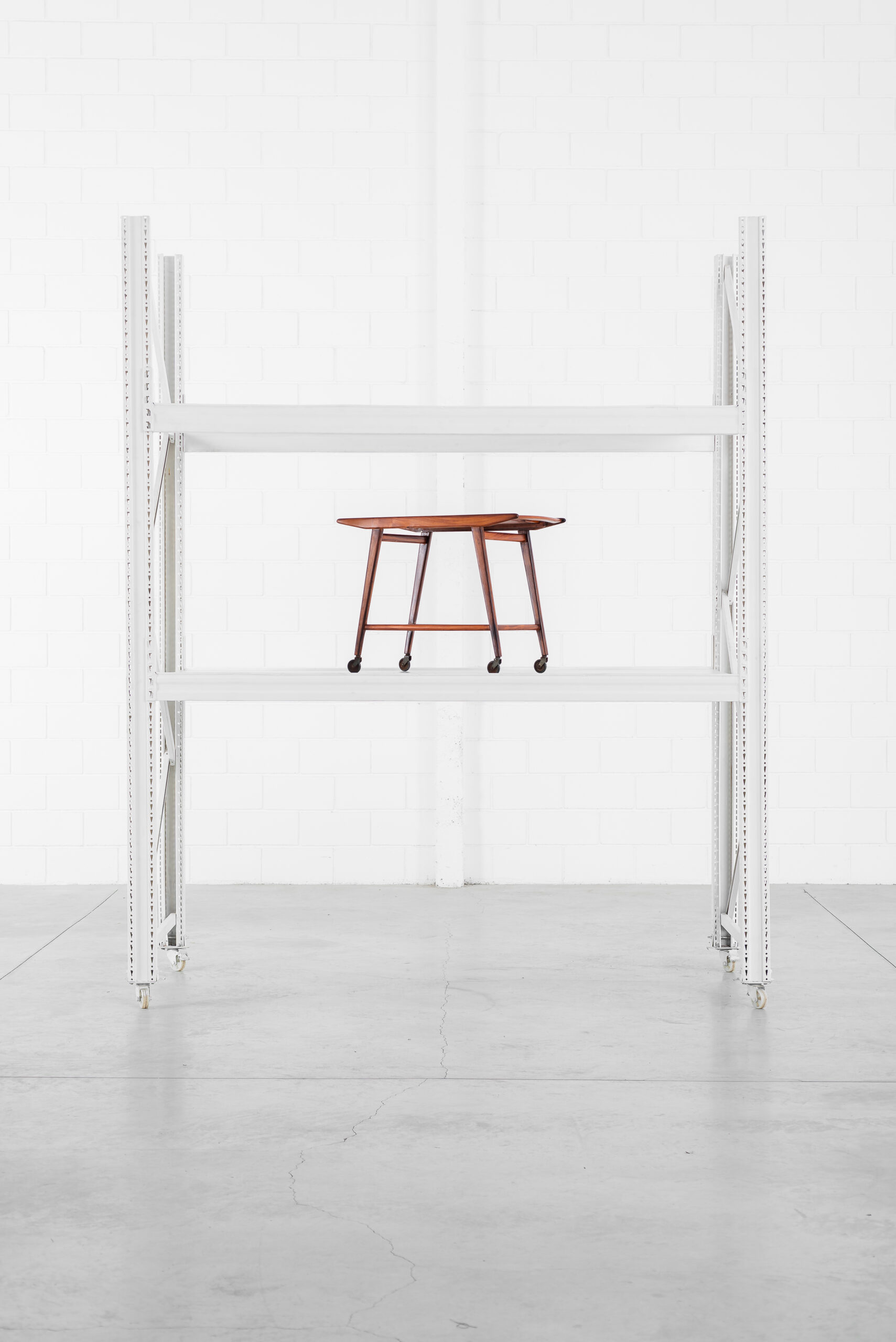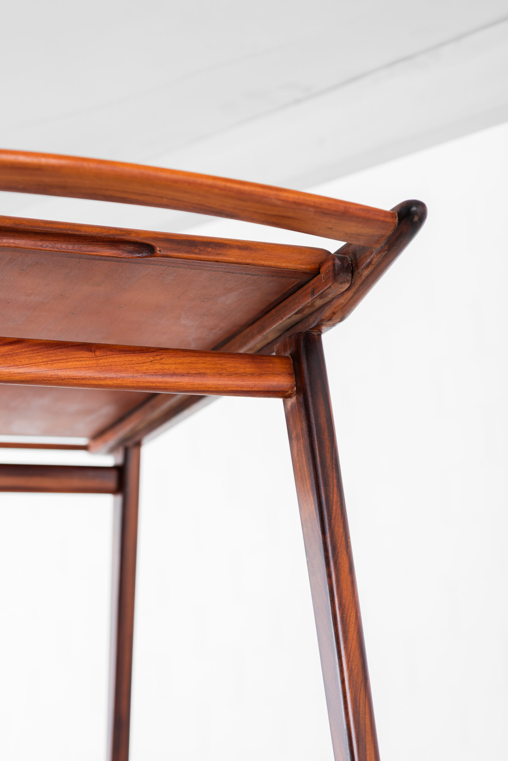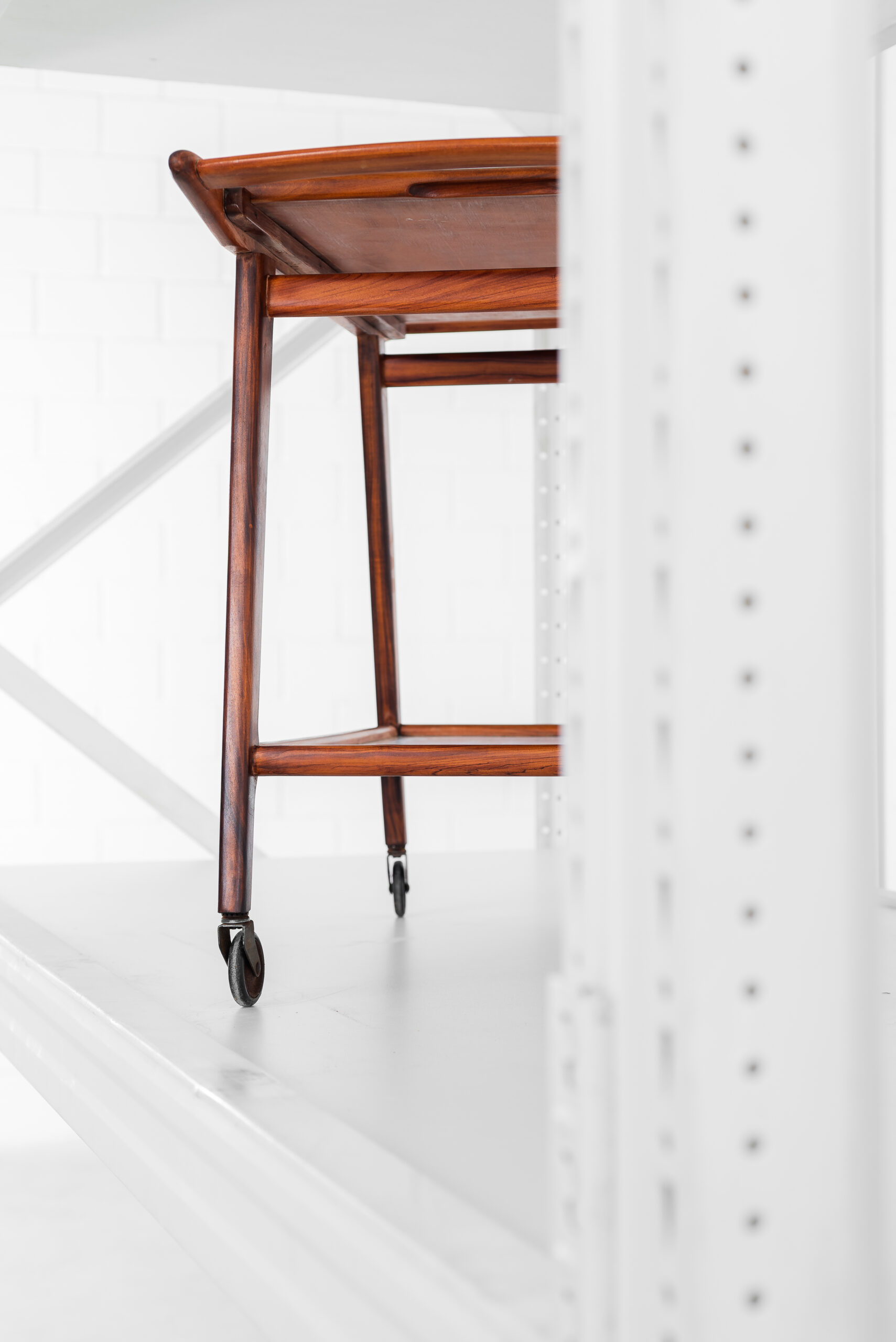 Carrinho de bebidas em madeira nobre e fórmica branca.